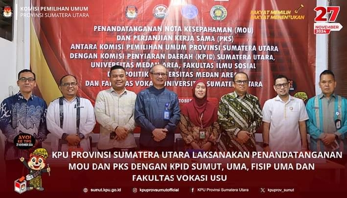 ArahIndonesia.com | Komisi Pemilihan Umum (KPU) Provinsi Sumatera Utara melaksanakan penandatanganan nota kesepahaman (MoU) dan perjanjian kerja sama (PKS) dengan Komisi Penyiaran Daerah Sumatera Utara (KPID Sumut), Universitas Medan Area (UMA), Fakultas Ilmu Sosial dan Ilmu Politik Universitas Medan Area (FISIP UMA), dan Fakultas Vokasi Universitas Sumatera Utara (USU) di Aula KPU Provinsi Sumatera Utara, Jumat (18/10/2024).