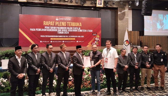 Penetapan tersebut termuat dalam surat keputusan KPU Sumut Nomor 139 Tahun 2025 Tentang Penetapan Pasangan Calon Gubernur dan Wakil Gubernur Terpilih Provinsi Sumatera Utara Tahun 2024, yang dibacakan oleh Ketua KPU Sumut, Agus Arifin, saat pelaksanaan Rapat Pleno Penetapan Pasangan Calon Terpilih Pada Pemilihan Gubernur dan Wakil Gubernur Sumatera Utara Tahun 2024 di Hotel Grand Mercure Medan, Rabu (05/02/2025) sore.